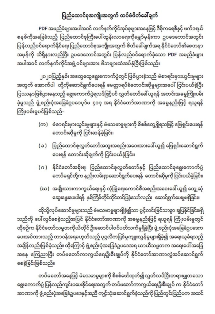 ပြည်တွင်းသတင်း ပြည်ထောင်စုအကျိုးအတွက် PDFများအလင်းဝင်နိုင်ဟု နိုင်ငံတော်မှထပ်မံဖိတ်ခေါ် admin 09/08/2025 0 မြန်မာ့ဂုဏ် ၊ စက်တင်ဘာ ၈ About the Author admin Administrator Visit Website View All Posts Post navigation Previous: တရုတ်ဖိတ်ခေါ်ဖူဆယ်ပြိုင်ပွဲမှာ မြန်မာ့လက်ရွေးစင်ဖူဆယ်အသင်းနဲ့ ဒိန်းမတ်အသင်းတို့ ဆီမီးမှာတွေဆုံNext: ထိုင်းဝန်ကြီးချုပ်သစ်နဲ့ လက်တွဲဆောင်ရွက်မယ်လို့ ထိုင်းနိုင်ငံမှာ တရားမဝင်နေထိုင်တဲ့ NUG ပြော Leave a Reply Cancel replyYour email address will not be published. Required fields are marked *Comment * Name * Email * Website Save my name, email, and website in this browser for the next time I comment. Δ Related News ပြည်တွင်းသတင်း ဥပဒေဘောင်အတွင်း၀င်ရောက် Sitt Naing 03/26/2026 0 ပြည်တွင်းသတင်း ဂါရ၀ပြုနှုတ်ဆက် Sitt Naing 03/26/2026 0 ပြည်တွင်းသတင်း ဂုဏ်ပြုညစာ စားပွဲကျင်းပ Sitt Naing 03/26/2026 0