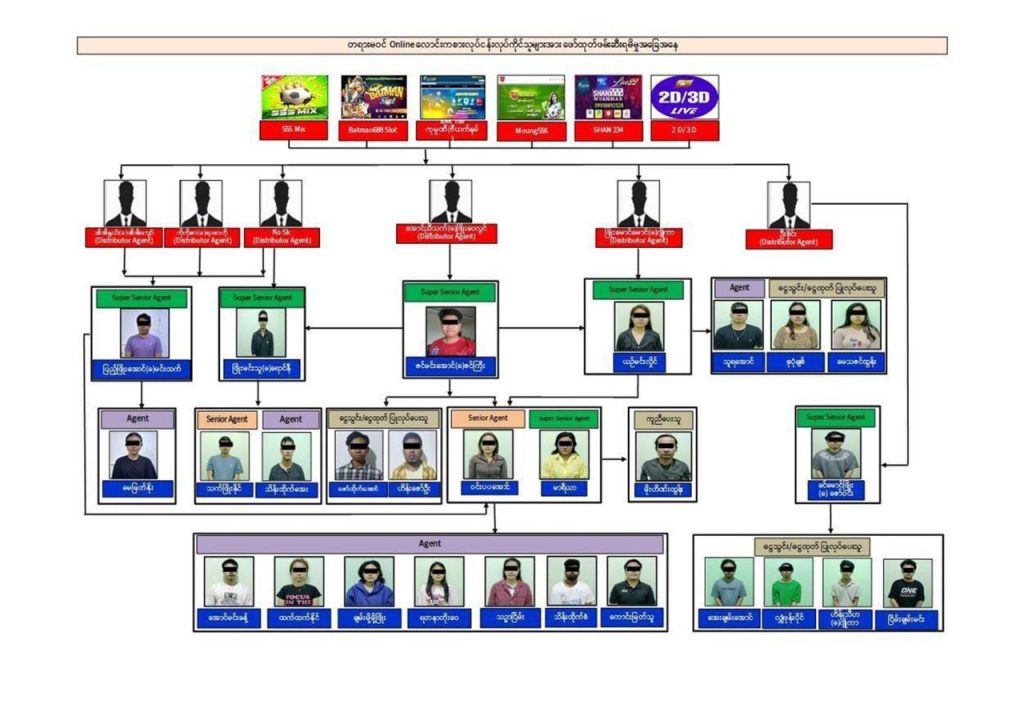 ဖမ်းဆီးရမိသူများ၏ထွက်ဆိုချက်များအရ Super Senior Agent များဖြစ်သူ ဇင်မင်းအောင် (ခ)ဇင်ကြီး၊ ဖြိုးမင်းသူ (ခ) ရောင်နီ၊ ပြည့်ဖြိုးအောင် (ခ) မင်းထက်၊ ယဉ်မင်းလှိုင်၊ မာရီယာနှင့် ခင်မောင်ဖြိုး (ခ) ဇော်ဝင်းတို့ ၆ ဦးမှ ချိတ်ဆက်ထားသည့် လောင်းကစား Website ရှိ Distributor Agent များထံမှ လောင်းကစားမှုပြုလုပ်နိုင်သည့် ယူနစ်များအား ဝယ်ယူပြီး Senior Agent များဖြစ်သူ ဝင်းပပအောင်နှင့် သက်ဖြိုးနိုင်တို့ ၂ ဦးအပါအဝင် Senior Agent များအား ညှိနှိုင်းဈေးနှုန်းဖြင့် ပြန်လည်ရောင်းချကြောင်း၊ ထို့နောက် Senior Agent များမှ Master Agent များ၊ Agent များဖြစ်သူ သူရအောင်၊ သိန်းထိုက်အေး၊ မေမြတ်နိုး၊ အောင်မင်းခန့်၊ သိန်းထိုက်စံ၊ ကောင်းမြတ်သူ၊ ထက်ထက်နိုင်၊ ချမ်းမို့မို့ဖြိုး၊ ရတနာတိုးဝေနှင့် သဉ္ဇာငြိမ်းတို့ ၁၀ ဦးအပါအဝင် Agent များနှင့် လောင်းကစားမှုပြုလုပ်သည့် User များထံသို့ အဆင့်ဆင့်ငွေကြေးအမြတ်ယူ၍ ပြန်လည်ရောင်းချကြောင်း၊ ငွေလွှဲ/ ငွေထုတ်ပြုလုပ်ခြင်းများအား မိုးဟိဏ်းထွန်း၊ ဇော်ထိုက်အောင်၊ ဟိန်းဇော်ဦး၊ စုပုံချစ်နှင့် မေသဇင်ထွန်း၊ အေးချမ်းအောင်၊ လျှံဖုန်းပိုင်၊ ဟိန်းသီဟ (ခ) ဂျိုကာနှင့် အောင်ချမ်းမင်းတို့ ၉ ဦးအပါအဝင် ငွေလွှဲ/ ငွေထုတ်ပြုလုပ်သူများမှ KBZ Special Account ၊ KBZ Bank Account ၊ AYA Bank Account ၊ YOMA Bank Account ၊ CB Bank Account ၊ UAB Bank Account ၊ ABank Account ၊ AYA Pay Account ၊ Kpay Account နှင့် Wavepay Account များ အသုံးပြု၍ ဆောင်ရွက်ခဲ့ကြောင်း စိစစ်သိရှိရပါတယ်။
