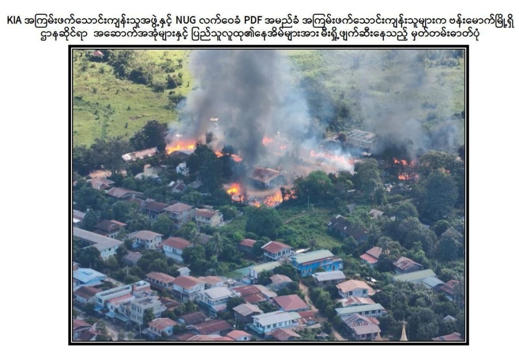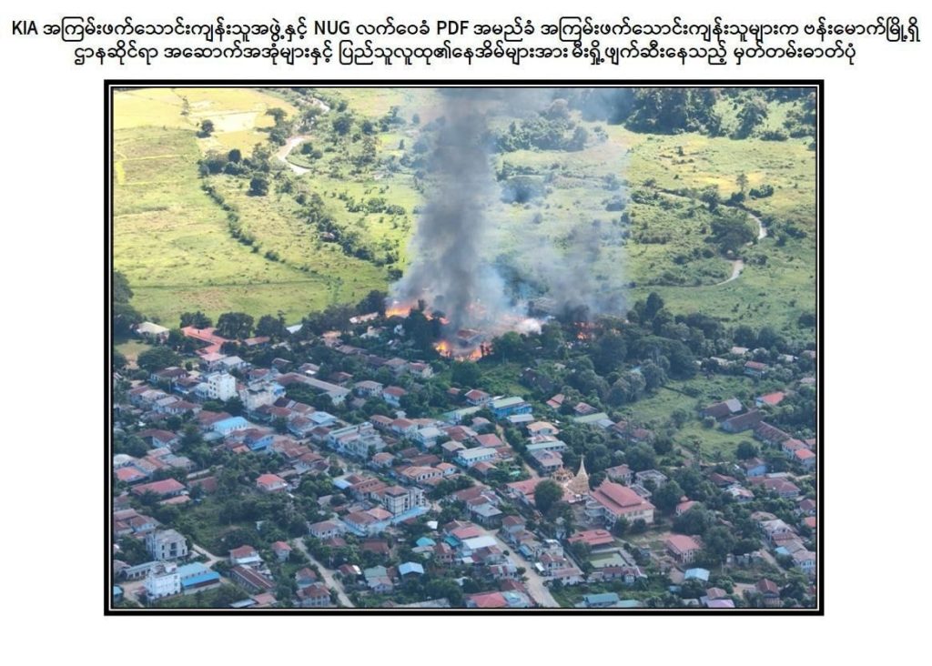 ထို့ကြောင့် အကြမ်းဖက်သောင်းကျန်းသူများ မီးရှို့ဖျက်ဆီးခဲ့သည့် ဗန်းမောက် မြို့အတွင်းရှိ အဆောက်အအုံများအား မီးအမြန်ဆုံးငြှိမ်းသတ်နိုင်ရေး အခြားသော ဗန်းမောက်မြို့နေပြည်သူလူထု၏အဆောက်အအုံများ မီးကူးစက်မှုမရှိစေရေး၊ ထပ်မံ၍အခြားအကြမ်းဖက်လုပ်ရပ်များ လုပ်ဆောင်မှု မရှိစေရေးအတွက် တပ်မတော်စစ်ကြောင်းများက ရင်ဆိုင်တိုက်ခိုက်လျက်ရှိသည့် လက်ကျန်အကြမ်းဖက် သောင်းကျန်းသူများအား အမြန်ဆုံးလက်စတုံးတိုက်ခိုက်ချေမှုန်းလျက်ရှိကြောင်း သိရပါတယ်။