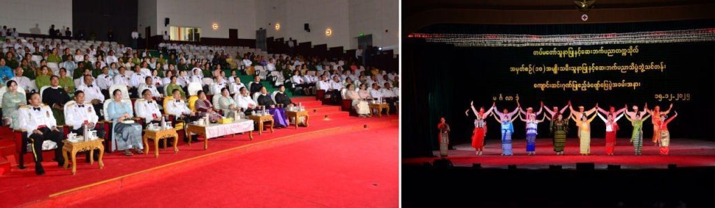 ထို့နောက် နိုင်ငံတော်လုံခြုံရေးနှင့် အေးချမ်းသာယာရေးကော်မရှင် ဒုတိယဥက္ကဋ္ဌ ဒုတိယတပ်မတော်ကာကွယ်ရေးဦးစီးချုပ်၊ ကာကွယ်ရေးဦးစီးချုပ် (ကြည်း) နှင့် အဖွဲ့ဝင်များသည် ကျောင်းဆင်းသူနာပြုများနှင့်အတူ သဘင်ဆောင်၌ ပြည်သူ့ဆက်ဆံရေးနှင့် စိတ်ဓာတ်စစ်ဆင်ရေး ညွှန်ကြားရေးမှူးရုံးကွပ်ကဲမှုအောက် မြဝတီတေးဂီတအဖွဲ့၏ ဂုဏ်ပြုဖျော်ဖြေတင်ဆက်မှုများကို ကြည့်ရှုအားပေးခဲ့ကြကြောင်းသိရပါတယ်။