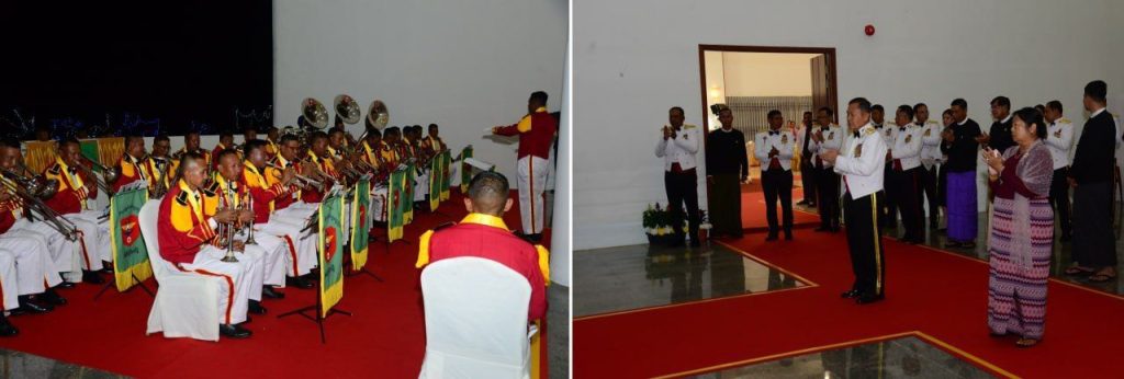 ညစာသုံးဆောင်အပြီးတွင် နိုင်ငံတော်လုံခြုံရေးနှင့် အေးချမ်းသာယာရေးကော်မရှင်ဒုတိယဥက္ကဋ္ဌ ဒုတိယတပ်မတော်ကာကွယ်ရေးဦးစီးချုပ်၊ ကာကွယ်ရေးဦးစီးချုပ် (ကြည်း) နှင့် အဖွဲ့ဝင်များသည် တပ်မတော်သူနာပြုနှင့် ဆေးဘက်ပညာတက္ကသိုလ် ဂုဏ်ပြုစစ်တီးဝိုင်း၏ ဂုဏ်ပြုတီးမှုတ်မှုအား ကြည့်ရှုအားပေးပြီး ချီးမြှင့်ငွေများ ပေးအပ်ပါတယ်။