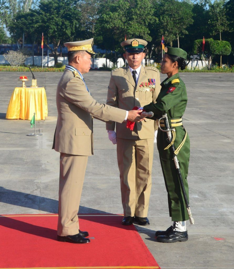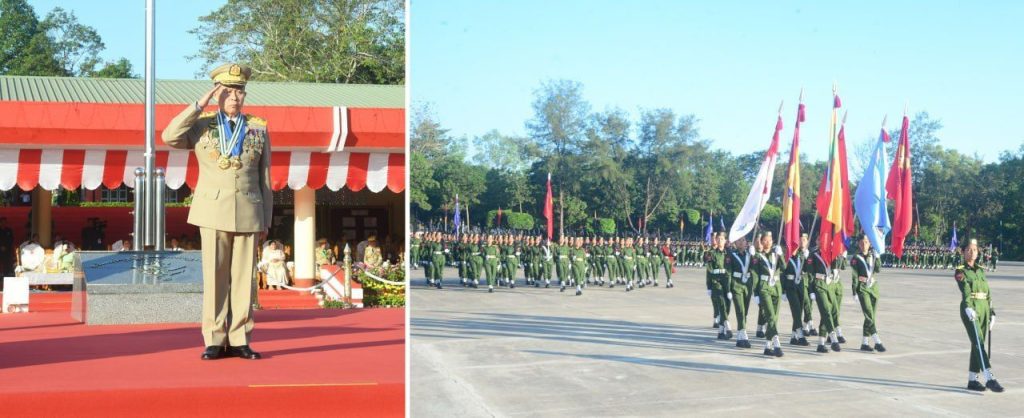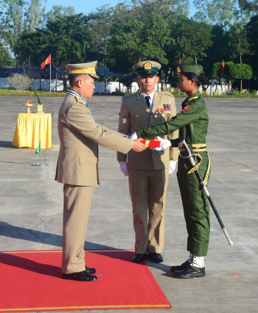 ဦးစွာ နိုင်ငံတော်လုံခြုံရေးနှင့် အေးချမ်းသာယာရေးကော်မရှင် ဒုတိယဥက္ကဋ္ဌ ဒုတိယတပ်မတော်ကာကွယ်ရေးဦးစီးချုပ်၊ ကာကွယ်ရေးဦးစီးချုပ် (ကြည်း) ဒုတိယဗိုလ်ချုပ်မှူးကြီး သီရိပျံချီ မဟာသရေစည်သူ စိုးဝင်းက သင်တန်းဆင်းတပ်ခွဲများ၏ အလေးပြုခြင်းကို ခံယူပြီး အလံတော်အဖွဲ့နှင့် ကျောင်းဆင်းတပ်ခွဲများအား စစ်ဆေးပါတယ်။