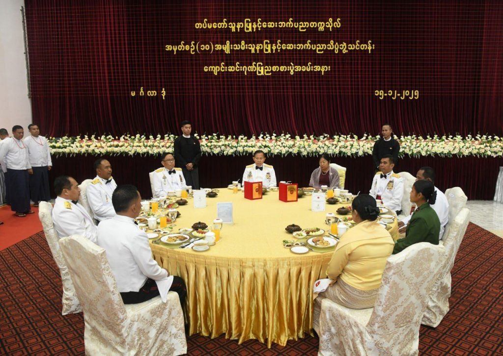 ညပိုင်းတွင် နိုင်ငံတော်လုံခြုံရေးနှင့် အေးချမ်းသာယာရေးကော်မရှင် ဒုတိယဥက္ကဋ္ဌ ဒုတိယတပ်မတော်ကာကွယ်ရေးဦးစီးချုပ်၊ ကာကွယ်ရေးဦးစီးချုပ် (ကြည်း) ဒုတိယဗိုလ်ချုပ်မှူးကြီး စိုးဝင်းနှင့် အဖွဲ့ဝင်များသည် အမျိုးသမီးသူနာပြုနှင့် ဆေးဘက်ပညာသိပ္ပံဘွဲ့သင်တန်း အမှတ်စဉ် (၁၀) သင်တန်းဆင်းဂုဏ်ပြုညစာစားပွဲအခမ်းအနားသို့ တက်ရောက်ချီးမြှင့်ပြီး သင်တန်းဆင်းသူနာပြုများ၊ ညစာစားပွဲတက်ရောက်လာကြသူများနှင့်အတူ ဂုဏ်ပြုညစာကို အတူတကွသုံးဆောင်ကြပါတယ်။