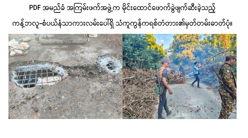 ထိုသို့လုပ်ဆောင်လျက်ရှိရာ ဒီဇင်ဘာလ ၁၇ ရက် နံနက် ၃ နာရီ ၃၀ မိနစ်ခန့်တွင် စစ်ကိုင်းတိုင်းဒေသကြီး၊ ကန့်ဘလူမြို့နယ်၊ ကန့်ဘလူ-စံပယ်နံ့သာကားလမ်းမိုင်တိုင်အမှတ် ၇ မိုင် ၄ ဖာလုံနှင့် ၅ ဖာလုံကြားရှိ တံတားအရှည် ၃၀ ပေ၊ အကျယ် ၂၇ ပေခန့်ရှိ သံကူကွန်ကရစ်တံတား အား PDF အမည်ခံ အကြမ်းဖက်အဖွဲ့က မိုင်းထောင်ဖောက်ခွဲဖျက်ဆီးသွားခဲ့ကြောင်း သတင်းအရ လုံခြုံရေးတပ်ဖွဲ့ဝင်များက သွားရောက်စစ်ဆေးရာ ပေါက်ကွဲမှုကြောင့် တံတားကြမ်းခင်း ၂ ပေ ပတ်လည်ခန့်ပျက်စီးဆုံးရှုံးခဲ့ပြီး လူနှင့် ယာဉ်များ ဖြတ်သန်းသွားလာမှု မရရှိစေရန် တံတားအား သစ်ကိုင်းများဖြင့် ပိတ်ဆို့ထားကြောင်း သိရှိရပါတယ်။