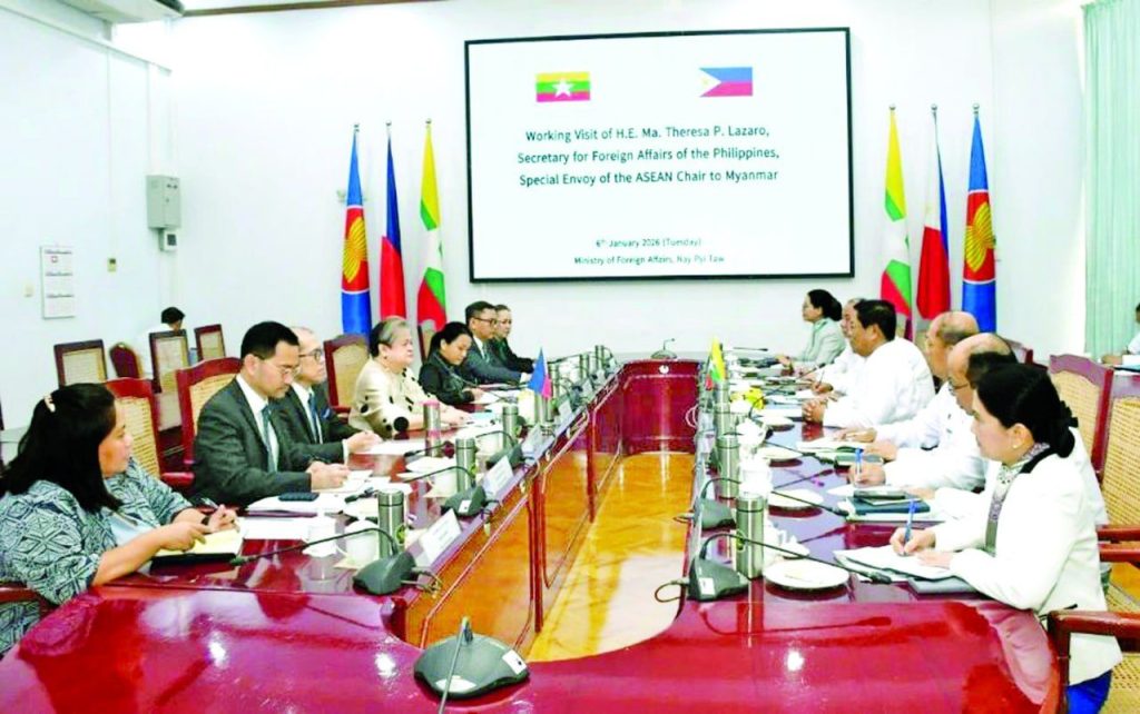 နိုင်ငံခြားရေးဝန်ကြီးဌာန ပြည်ထောင်စုဝန်ကြီး ဦးသန်းဆွေသည် ဇန်နဝါရီ ၅ ရက်မှ ၇ ရက်အထိ မြန်မာနိုင်ငံသို့ အလုပ်သဘောခရီးစဉ် လာရောက်သည့် အာဆီယံဥက္ကဋ္ဌ၏ မြန်မာနိုင်ငံဆိုင်ရာ အထူး ကိုယ်စားလှယ် ဖိလစ်ပိုင်နိုင်ငံခြားရေးဝန်ကြီး H.E. Ms. Maria Theresa Parreno Lazaro ဦးဆောင်သည့် ကိုယ်စားလှယ်အဖွဲ့အား ယမန်နေ့တွင် နေပြည်တော်ရှိ နိုင်ငံခြားရေးဝန်ကြီးဌာန၌ တွေ့ဆုံပါတယ်။