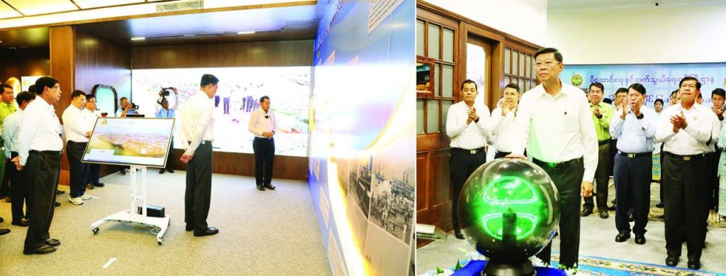 ထို့နောက် ပြည်ထောင်စုဝန်ကြီးနှင့် ဧည့်သည်တော်ကြီးများကို ပြခန်းအတွင်း မြန်မာ့ဆိပ်ကမ်းအာဏာပိုင် ဦးဆောင်ညွှန်ကြားရေးမှူးနှင့် တာဝန်ရှိသူများက လိုက်လံပြသရှင်းလင်းတင်ပြပါတယ်။