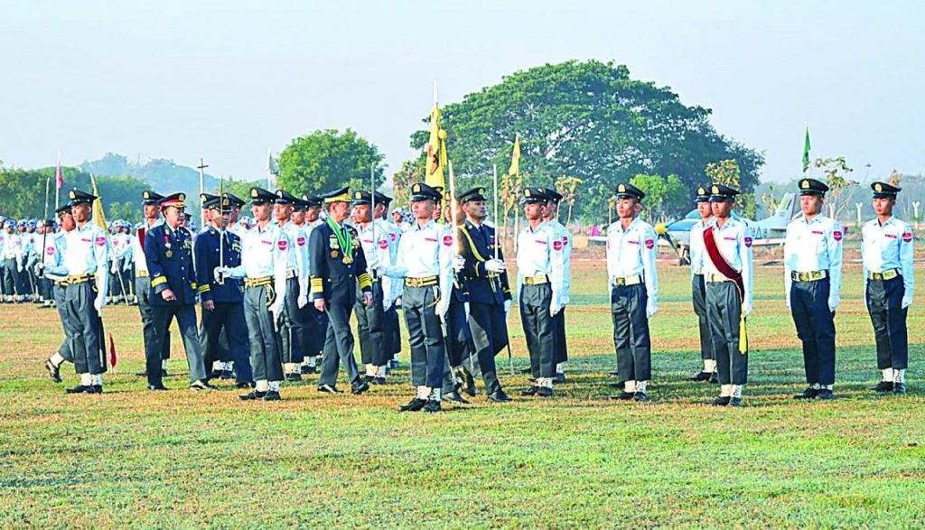 ထို့နောက် ကျောင်းဆင်းတပ်ခွဲနှင့် ဂုဏ်ပြုတပ်ခွဲများက ကာကွယ်ရေးဦးစီးချုပ်(လေ)အား အနှေးလျှောက်၊ အမြန်လျှောက်ဖြင့် ချီတက်အလေးပြုကြပြီး နည်းပြလေသူရဲများက အမောင်းသင် လေယာဉ်၊ ရဟတ်ယာဉ်များဖြင့် အုပ်ဖွဲ့ပျံသန်းအလေးပြုကြပါတယ်။
