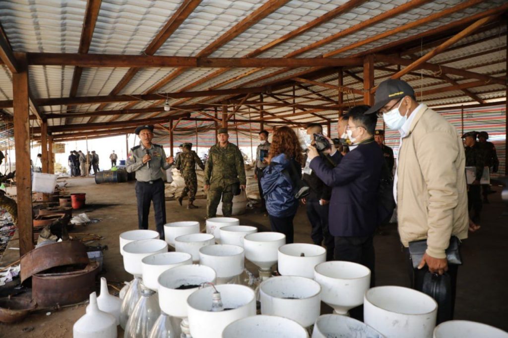 ထို့နောက် ဖော်ထုတ်ဖမ်းဆီးရမိသည့် မူးယစ်ဆေးဝါးချက်လုပ်ရာတွင်အသုံးပြုသော ဓာတုပစ္စည်းများ၊ ဆက်စပ်ပစ္စည်းများခင်းကျင်းပြသထားရှိမှုအား လိုက်လံကြည့်ရှုလေ့လာကြပြီး မူးယစ်ဆေးဝါးချက်လုပ်ရာ၌ အသုံးပြုခဲ့သည့် ယာယီအဆောက်အဦများ၊ ဓာတုပစ္စည်းများ၊ မူးယစ်ဆေးဝါးချက်လုပ်ရာတွင်အသုံးပြုသော ဆက်စပ်ပစ္စည်းများကို နေရာတစ်ခုချင်းစီ အလိုက် လိုက်လံရှင်းလင်းပြသခဲ့ကာ သတင်းမီဒီယာများ၏ သိရှိလိုသည့် မေးမြန်းမှုများ အပေါ် တာဝန်ရှိသူများနှင့် ဖော်ထုတ်သိမ်းပိုက်ရာတွင် ပါဝင်ခဲ့ကြသည့် လုံခြုံရေးတပ်ဖွဲ့ဝင် များက ပြန်လည်ရှင်းလင်းဖြေကြားခဲ့ကြပါတယ်။