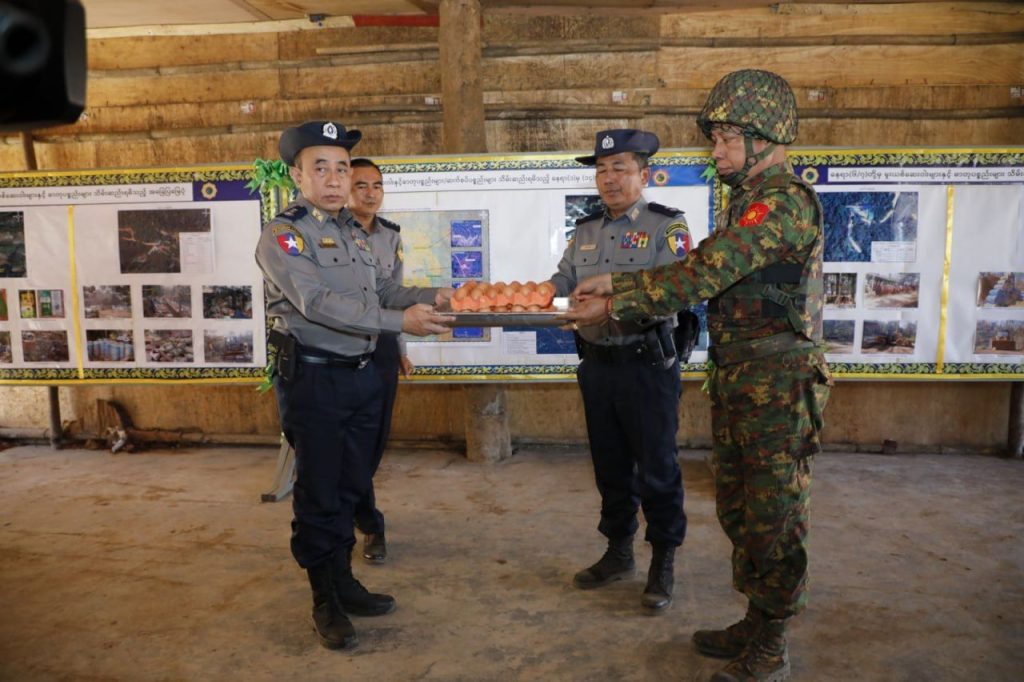 ယင်းနောက် မူးယစ်ဆေးဝါးစစ်ဆင်ရေးတွင်ပါဝင်ခဲ့ကြသည့် တပ်မတော်နှင့် မြန်မာနိုင်ငံ ရဲတပ်ဖွဲ့ဝင်များအတွက် စားသောက်ဖွယ်ရာပစ္စည်းများကို ပြည်ထဲရေးဝန်ကြီးဌာနက ချီးမြှင့် ပေးအပ်ရာ တာဝန်ရှိသူများက လက်ခံရယူကြပါတယ်။