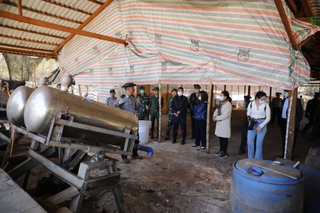 ဆက်လက်၍ အမျိုးသားကာကွယ်ရေးနှင့်လုံခြုံရေးကောင်စီ သတင်းထုတ်ပြန်ရေးအဖွဲ့ အဖွဲ့ခေါင်းဆောင် ပြန်ကြားရေးဝန်ကြီးဌာန ဒုတိယဝန်ကြီး၊ မြန်မာနိုင်ငံရဲတပ်ဖွဲ့၊ ရဲချုပ်နှင့် တာဝန်ရှိသူများ၊ သံတမန်များ၊ သတင်းမီဒီယာ အဖွဲ့များသည် မိုင်းရယ်မြို့၏ အနောက်တောင် ဘက် ၉ ကီလိုမီတာခန့်အကွာရှိ မူးယစ်ဆေးဝါး ထုတ်လုပ်သည့်နေရာသို့ ရောက်ရှိကြပြီး မူးယစ်ဆေးဝါးချက်လုပ်ရာ၌ အသုံးပြုခဲ့သည့် ယာယီအဆောက်အဦများ၊ ဓာတုပစ္စည်းများ၊ မူးယစ်ဆေးဝါးချက်လုပ်ရာတွင်အသုံးပြုသော ဆက်စပ်ပစ္စည်းများကို တာဝန်ရှိသူများကနေရာတစ်ခုချင်းစီအလိုက် လိုက်လံရှင်းလင်းပြသခဲ့ကာ သိရှိလိုသည့်မေးမြန်းမှုများအပေါ် ပြန်လည် ရှင်းလင်းဖြေကြားခဲ့ပါတယ်။